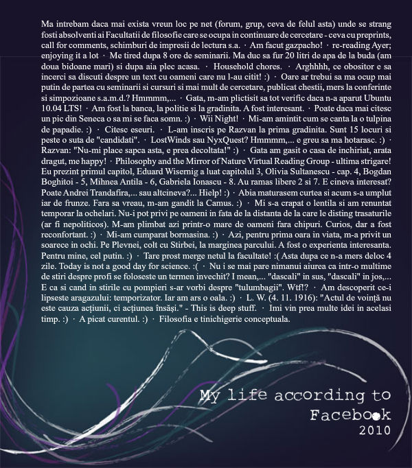 Sunt insemnari care au legatura, mai mult sau mai putin, cu un articol la care lucrez in perioada asta. Sunt constient de faptul ca seamna, ca stil, cu unele insemnari facute de Wittgenstein (poate si fiindca am recitit insemnarile lui din perioada 1914-1916, in traducerea lui Catalin Cioaba), dar nu cred ca lucrul asta are vreo importanta. Textele pe care le consider publicabile nu arata asa.