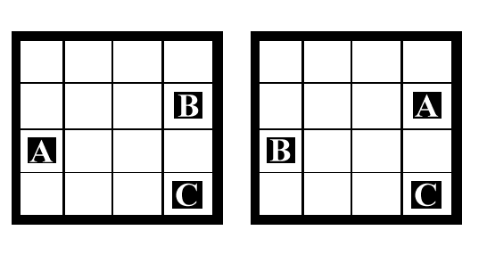 [21] După aplicarea regulii vom conchide acum că pătratul din stânga este B, iar dintre cele două pătrate din dreapta, cel de sus este C și cel de jos este A.